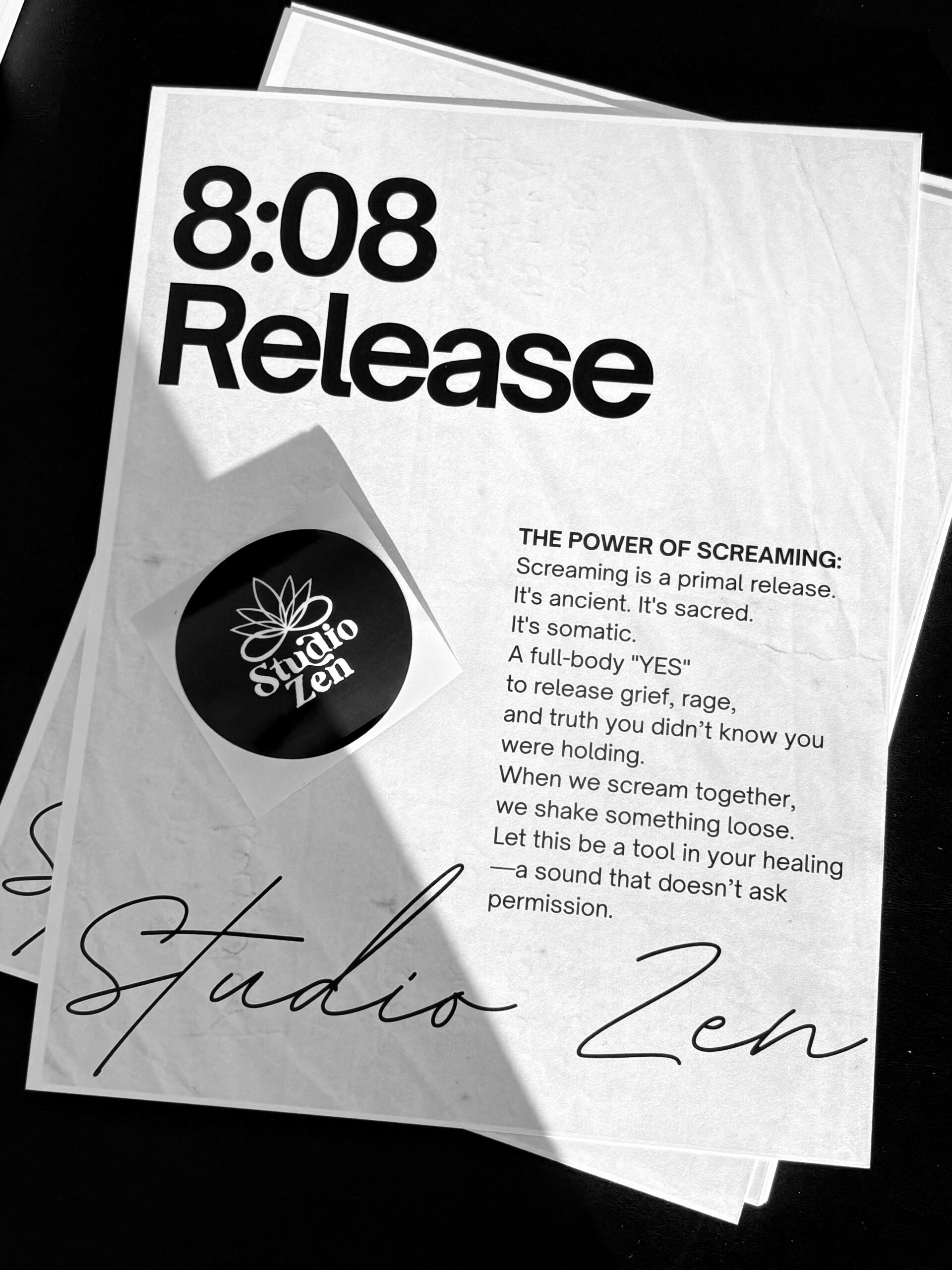 On the 8th of every month at 8:00 p.m., Studio Zen invites you to gather in community for a powerful release. Our Release Event is a safe, intentional space to let go of stress, grief, anger, and anything else you’ve been holding inside. Together, we use the primal act of screaming — a sound the body naturally creates when words aren’t enough — to reset our nervous systems and reconnect with our inner strength.